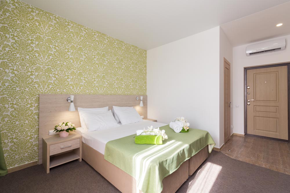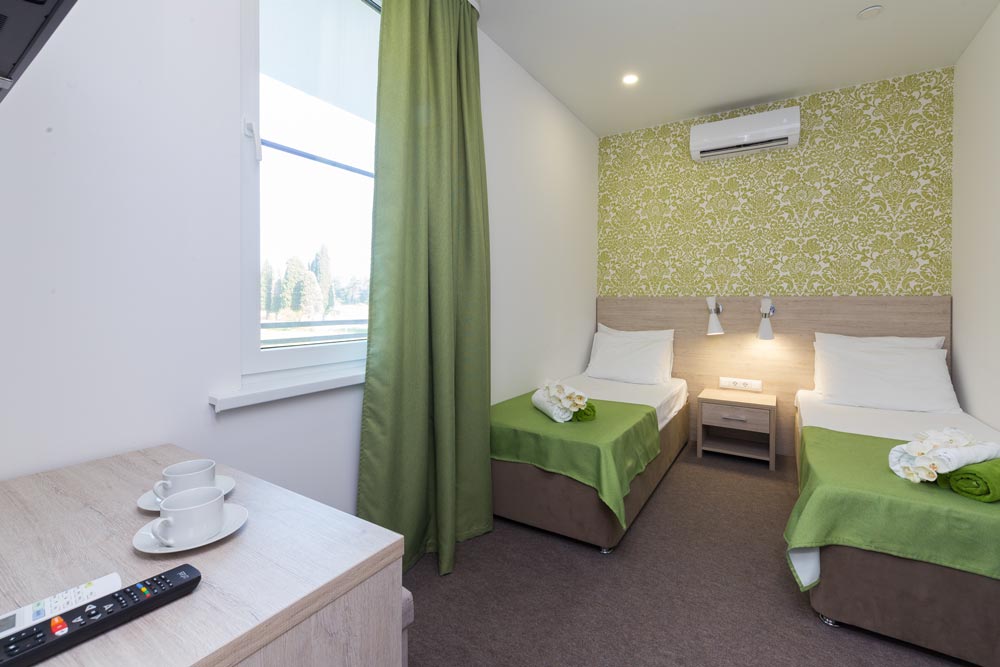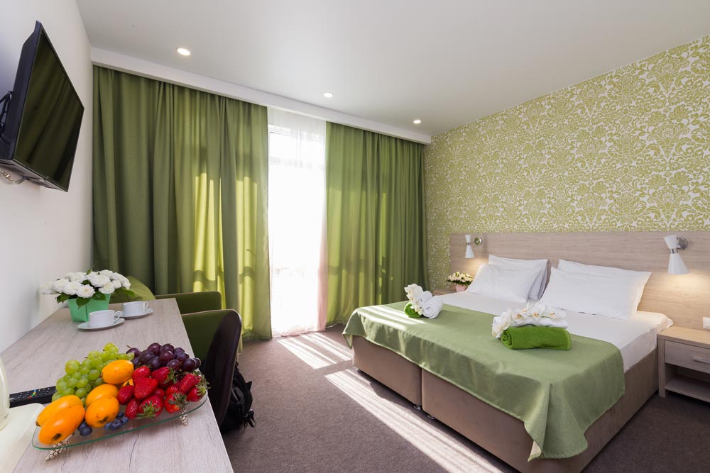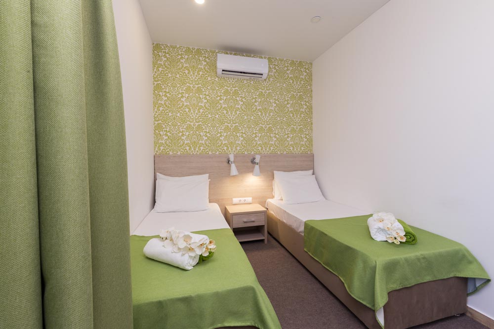 Площадь номера - 35 кв.м. 4 осн. места. 1 доп. место. Балкон. Мебель: вешалка, зеркало, кресло-кровать, кровати односпальные (2), кровать двуспальная, прикроватные тумбочки, стол, стулья, шкаф. Оборудование: сейф, сплит-система, телевизор ЖК, холодильник, чайная станция. Санузел: с душевой кабиной, тапочки, туалетные принадлежности, фен, халат. Сервис: Wi-Fi бесплатно, смена полотенец, смена постельного белья, уборка номера.